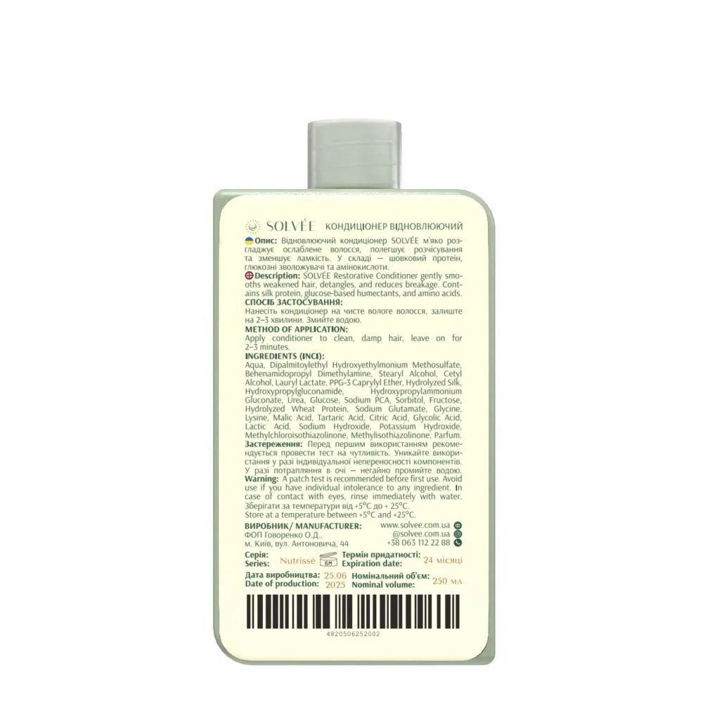 Solvée Nutrissé restorative conditioner – відновлюючий кондиціонер для ослабленого та пошкодженого волосся. Інтенсивно живить, розгладжує та зміцнює волосся по всій довжині, повертаючи йому м’якість і природний блиск. Формула розроблена для догляду після фарбування, кератину чи частого термостайлінгу. Містить активні компоненти: гідролізований шовк, який глибоко проникає у структуру волосся, зміцнюючи її та додаючи гладкості; комплекс амінокислот і глюконатів (Hydroxypropylgluconamide, Hydroxypropylammonium Gluconate), що сприяють відновленню пошкоджених ділянок і підвищують еластичність волосся; гідролізований білок пшениці, який надає волоссю силу й блиск. Формула без агресивних компонентів дбайливо розплутує волосся, усуває ламкість і статичність. Після використання волосся стає м’яким, слухняним і сяючим. Ідеальний завершальний етап після шампуню Solvée Nutrissé.