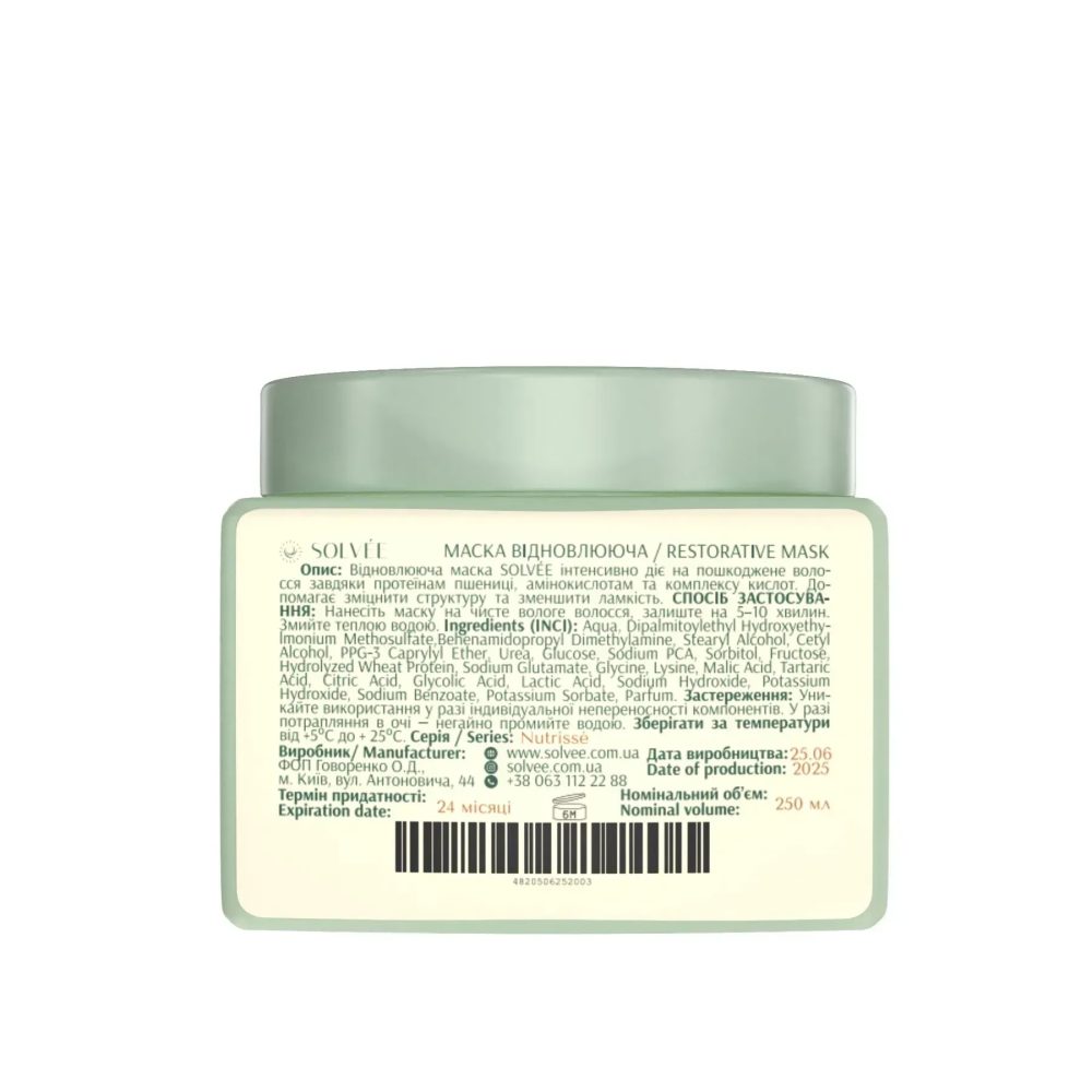 Solvée Nutrissé restorative mask – відновлююча маска для пошкодженого, ослабленого та тьмяного волосся. Формула створена для глибокого живлення та реконструкції волосся після фарбування, термоукладок або кератинових процедур. Засіб інтенсивно відновлює структуру волосся, повертаючи йому м’якість, силу та природний блиск. Містить активні компоненти: гідролізований білок пшениці, який зміцнює волосяне волокно та заповнює пошкоджені ділянки; глюкозу, сорбітол і фруктозу, що зволожують і пом’якшують волосся, роблячи його еластичним; молочну, гліколеву та лимонну кислоти, які допомагають вирівняти кутикулу та надати волоссю гладкості. Маска має кремову текстуру, легко розподіляється, не обтяжує та забезпечує ефект професійного догляду вдома. Після використання волосся стає щільнішим, м’яким і сяючим по всій довжині.