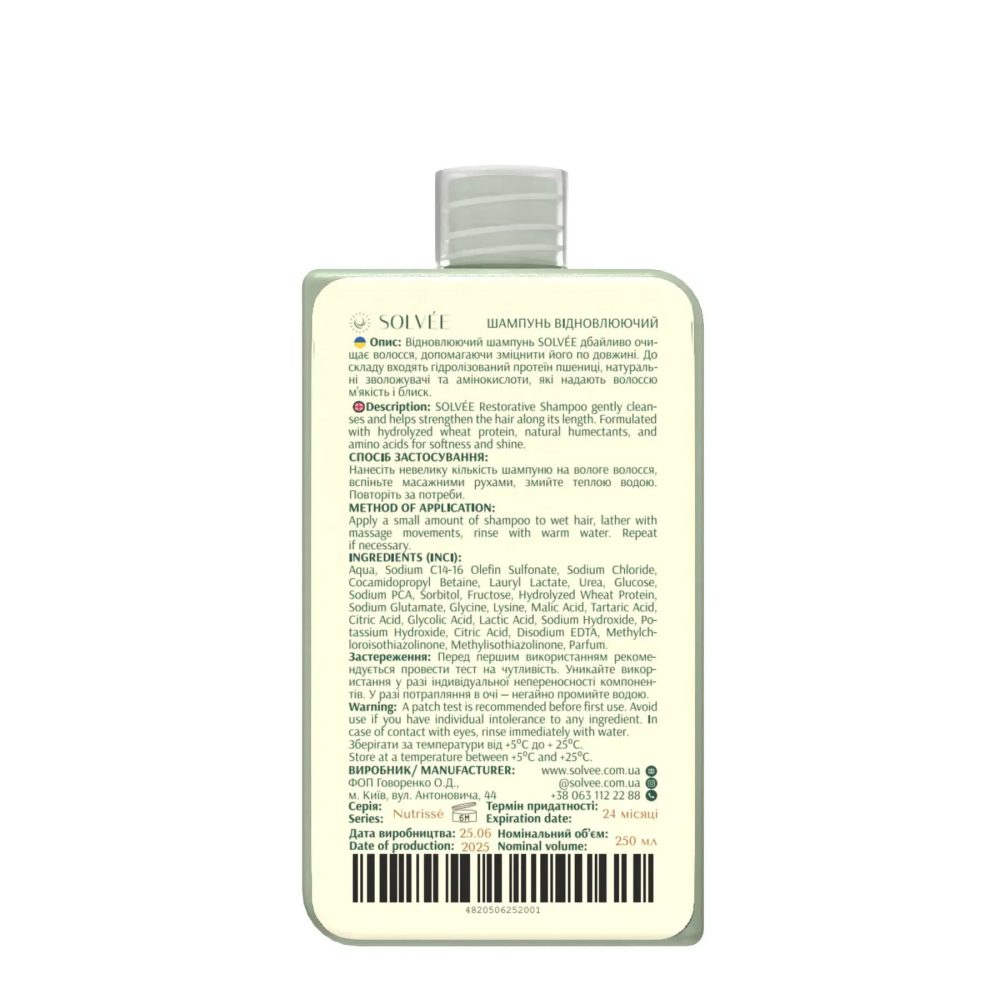 Solvée Nutrissé restorative shampoo – відновлюючий шампунь для сухого та пошкодженого волосся. Делікатно очищає, насичує волосся поживними компонентами та допомагає відновити його природну м’якість і блиск. Формула розроблена спеціально для волосся, що втратило вологу після фарбування, термоукладок або хімічних процедур. Містить активні інгредієнти: гідролізований білок пшениці, який зміцнює структуру волосся та відновлює її зсередини; глюкозу та фруктозу, що пом’якшують і підтримують еластичність; молочну та лимонну кислоти, які вирівнюють поверхню волосся, додаючи гладкості й блиску. Кокамідопропіл бетаїн із кокосової олії забезпечує м’яке очищення без пересушення. Формула без агресивних компонентів дбайливо доглядає навіть за чутливим волоссям, повертаючи йому шовковистість, життєву силу та здоровий вигляд. Підходить для щоденного використання.