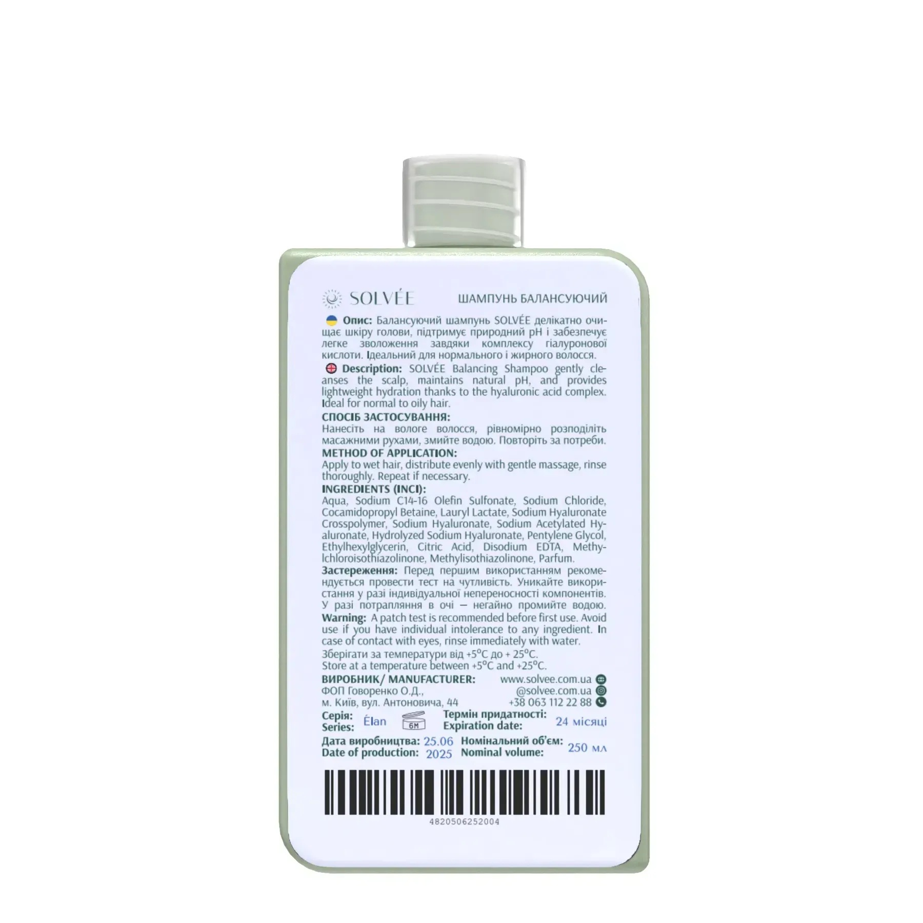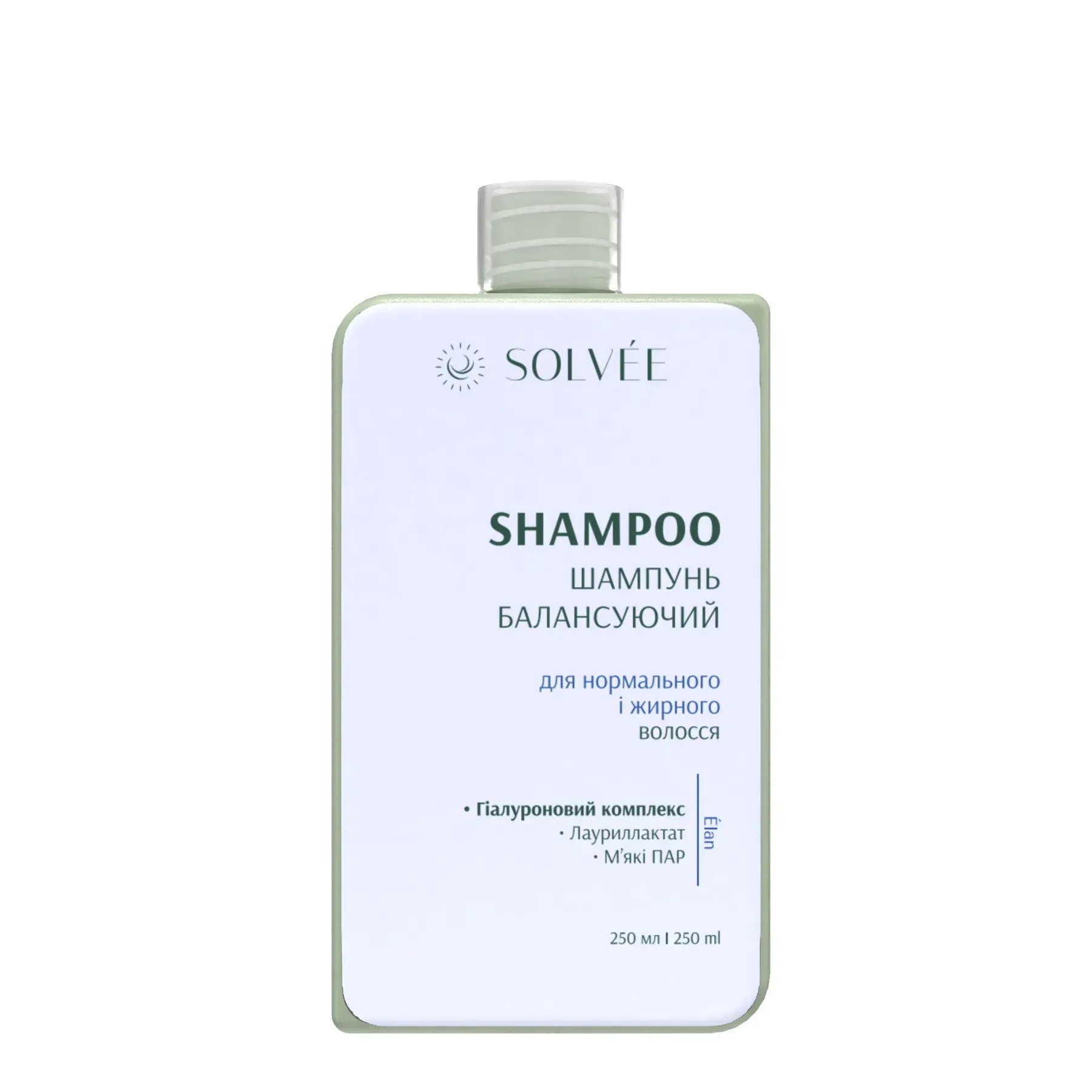 Solvée Élan balancing shampoo – балансуючий шампунь для нормального та жирного типу волосся і шкіри голови. Формула з гіалуроновим комплексом. Засіб ефективно видаляє надлишок себуму, не пересушуючи волосся, і підтримує відчуття свіжості надовго. Містить активні компоненти: гіалуронат натрію, гідролізований гіалуронат натрію та ацетильований гіалуронат натрію, які разом утворюють зволожувальний комплекс, що наповнює волосся вологою та запобігає його пересушуванню. Кокамідопропіл бетаїн із похідних кокосу м’яко очищає, зменшує подразнення й дарує волоссю природну м’якість.
