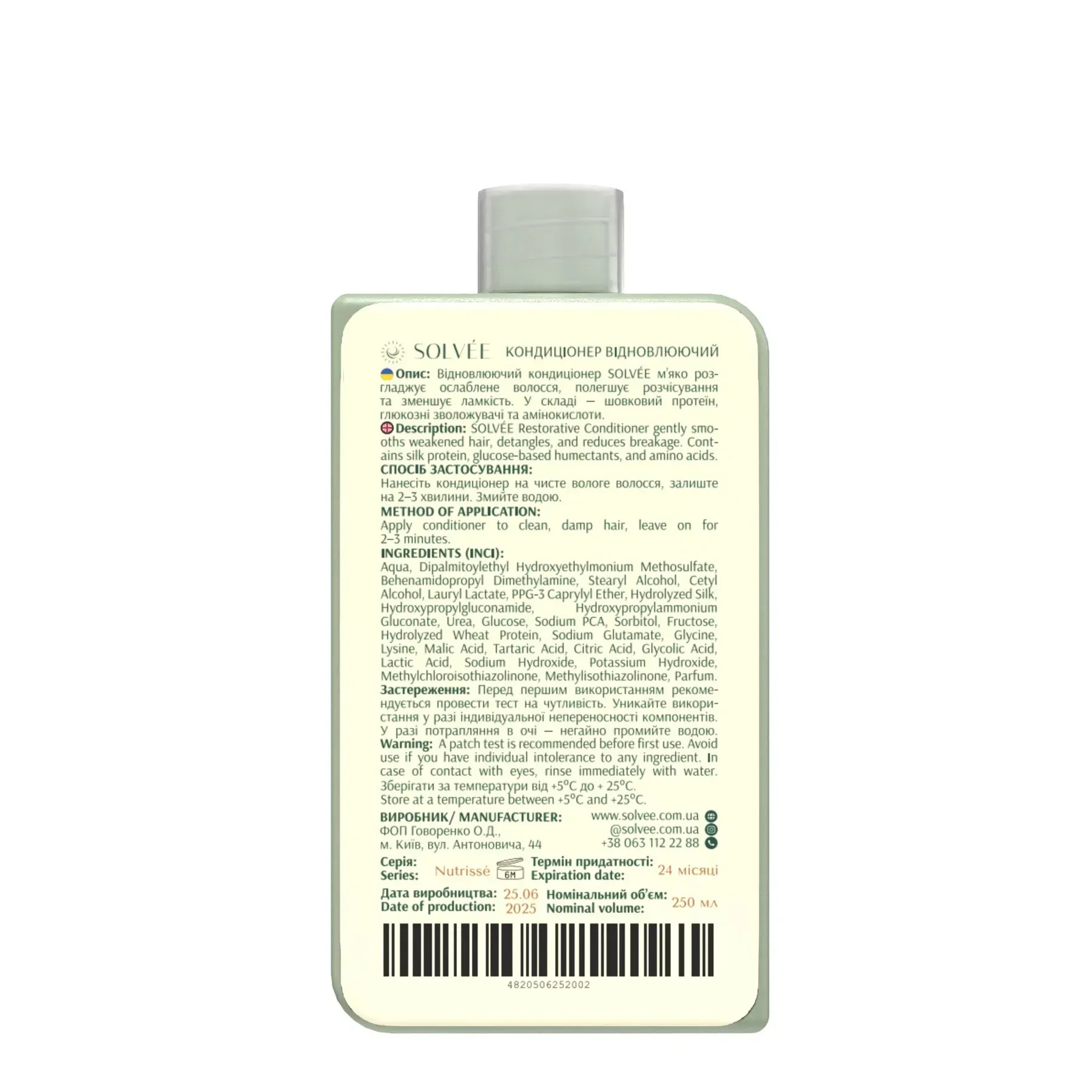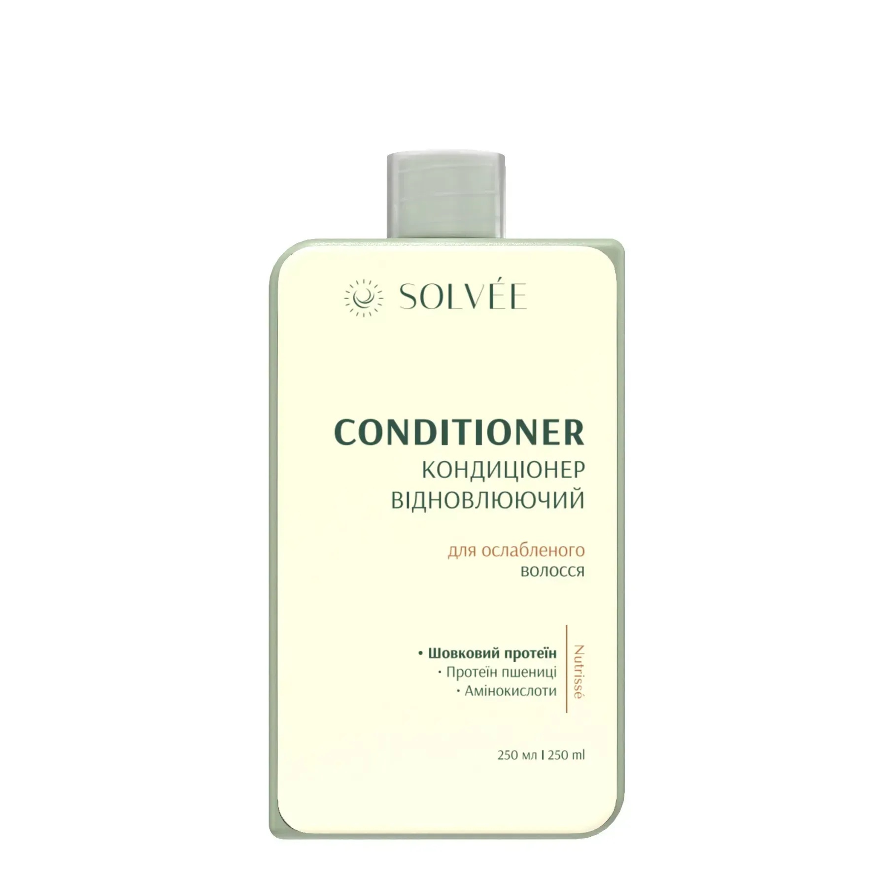 Solvée Nutrissé restorative conditioner – відновлюючий кондиціонер для ослабленого та пошкодженого волосся. Інтенсивно живить, розгладжує та зміцнює волосся по всій довжині, повертаючи йому м’якість і природний блиск. Формула розроблена для догляду після фарбування, кератину чи частого термостайлінгу. Містить активні компоненти: гідролізований шовк, який глибоко проникає у структуру волосся, зміцнюючи її та додаючи гладкості; комплекс амінокислот і глюконатів (Hydroxypropylgluconamide, Hydroxypropylammonium Gluconate), що сприяють відновленню пошкоджених ділянок і підвищують еластичність волосся; гідролізований білок пшениці, який надає волоссю силу й блиск. Формула без агресивних компонентів дбайливо розплутує волосся, усуває ламкість і статичність. Після використання волосся стає м’яким, слухняним і сяючим. Ідеальний завершальний етап після шампуню Solvée Nutrissé.
